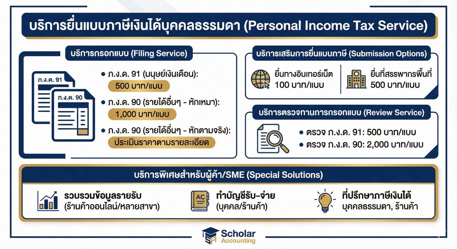 3.บริการด้านภาษี – ให้คำปรึกษาและดำเนินการเรื่องภาษีอากรครบวงจร ตั้งแต่การวางแผนภาษี การยื่นแบบภาษีเงินได้/ภาษีมูลค่าเพิ่ม ไปจนถึงการเป็นตัวแทนพบกรมสรรพากรในกรณีมีประเด็นภาษี